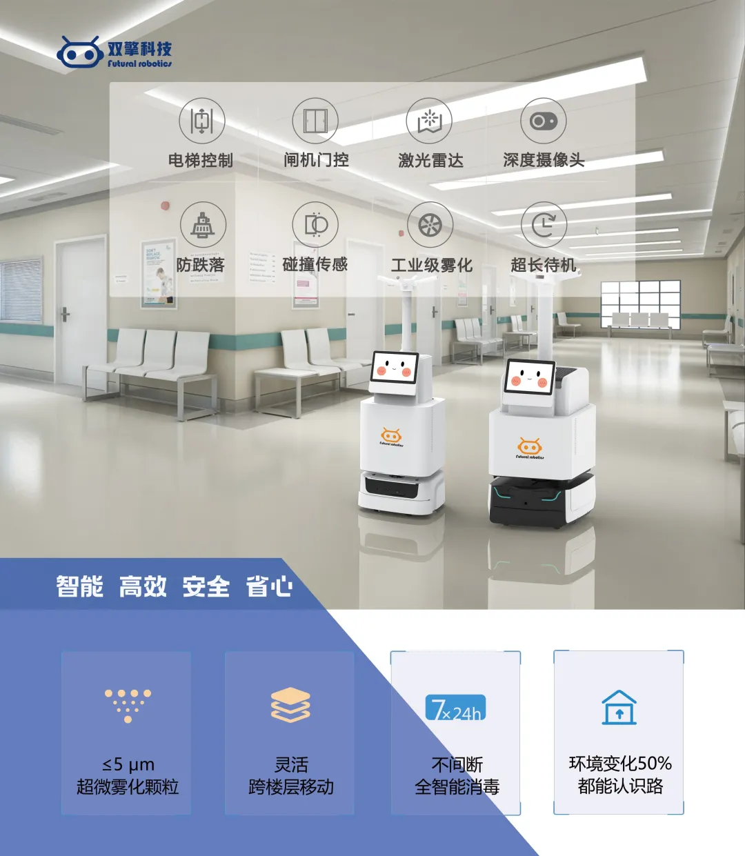 双擎喷雾消毒机器人采用全新超声波雾化技术,能快速将消毒液雾化成8μm以下超微颗粒,配合高性能送风系统,迅速将雾化的消毒液、负离子等弥散至全空间,并与空气中的气溶胶、病菌等充分结合,实现360°立体空间全覆盖空气消毒,守护人群的健康。双擎喷雾消毒机器人可利用机器人的自主工作能力,经济高效地实现定时、定点、定量自主执行消毒任务,将工作人员从繁重、重复的消毒任务中解放出来,避免二次感染、交叉感染伤害。完全满足医院消毒和公共场所常态化预防性消毒需求。目前双擎消毒机器人已在全国近百家医院、办公楼宇、商场、博物馆执行消毒任务。 |