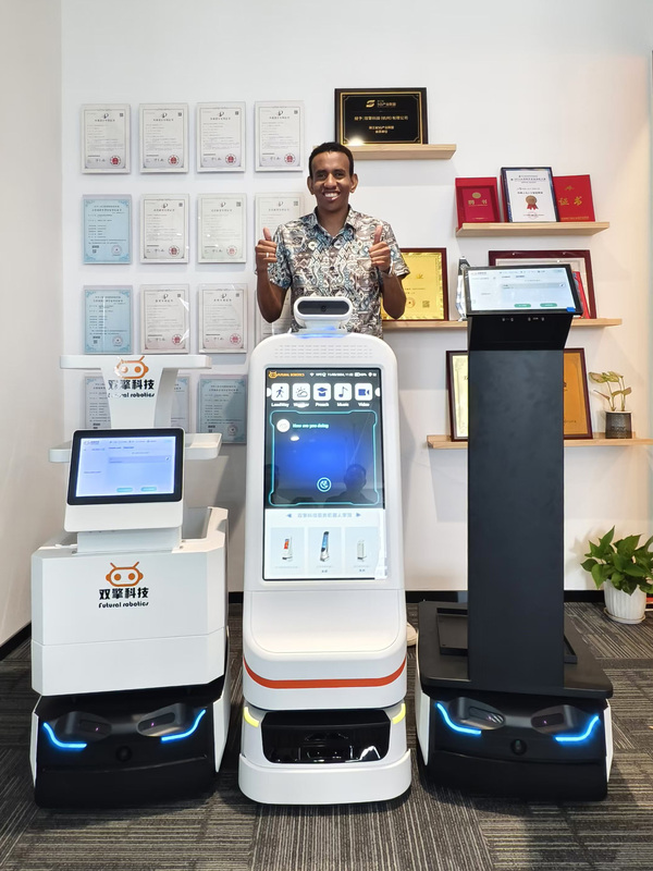 双擎的工程师们热情地为远道而来的朋友们,详细介绍了双擎的三大产品系列,分别是迎宾接待机器人、医疗服务(配送 + 运输)机器人以及工厂转运机器人。每一款机器人都凝聚着双擎团队对技术的极致追求与创新精神。从低速无人驾驶的精准控制,到云计算与多模态识别技术的无缝融合,双擎机器人以其卓越的性能和前沿的技术,赢得了中东客户的高度评价。 携手并进,共同开拓中东市场